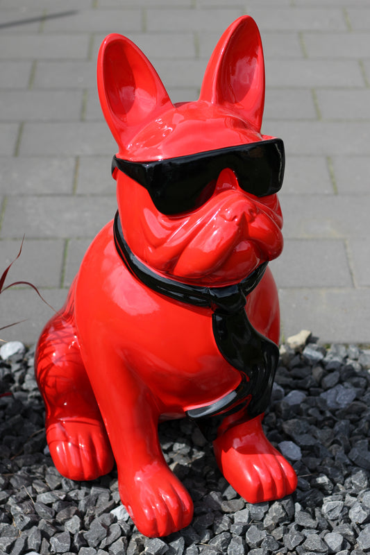 Französische Bulldogge mit Brille und Krawatte rot aus Kunstharz - 78cm