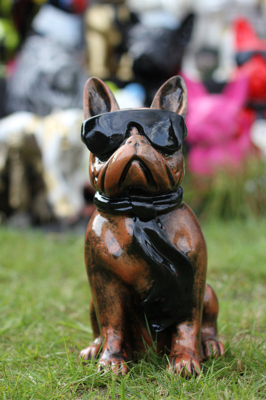 Französische Bulldogge mit Brille und Krawatte bronze-antik aus Kunstharz - 30cm