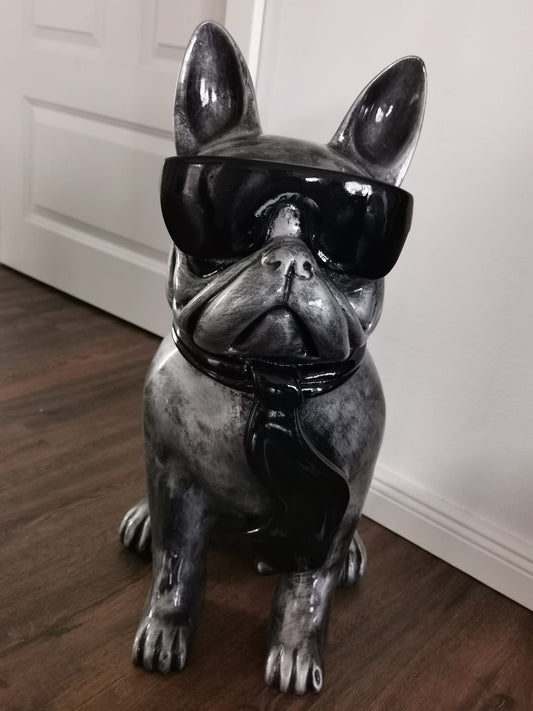 Französische Bulldogge mit Brille und Krawatte silber-antik aus Kunstharz - 58cm