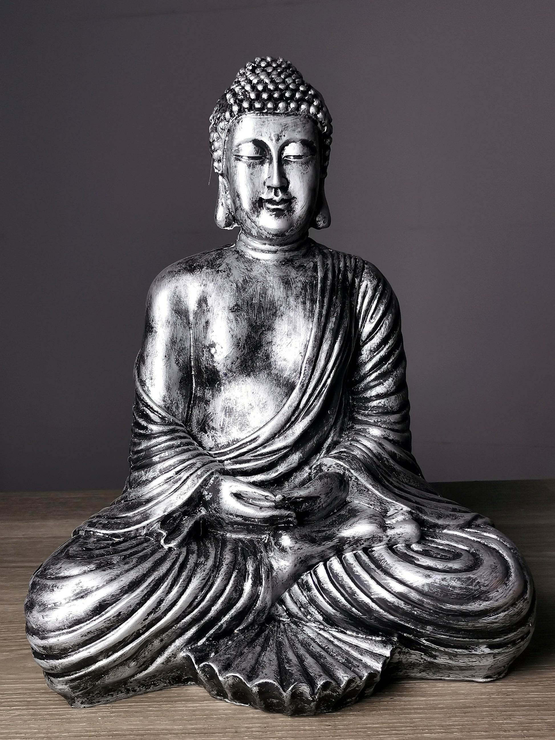 Buddha aus Kunstharz silber-antik - 42cm