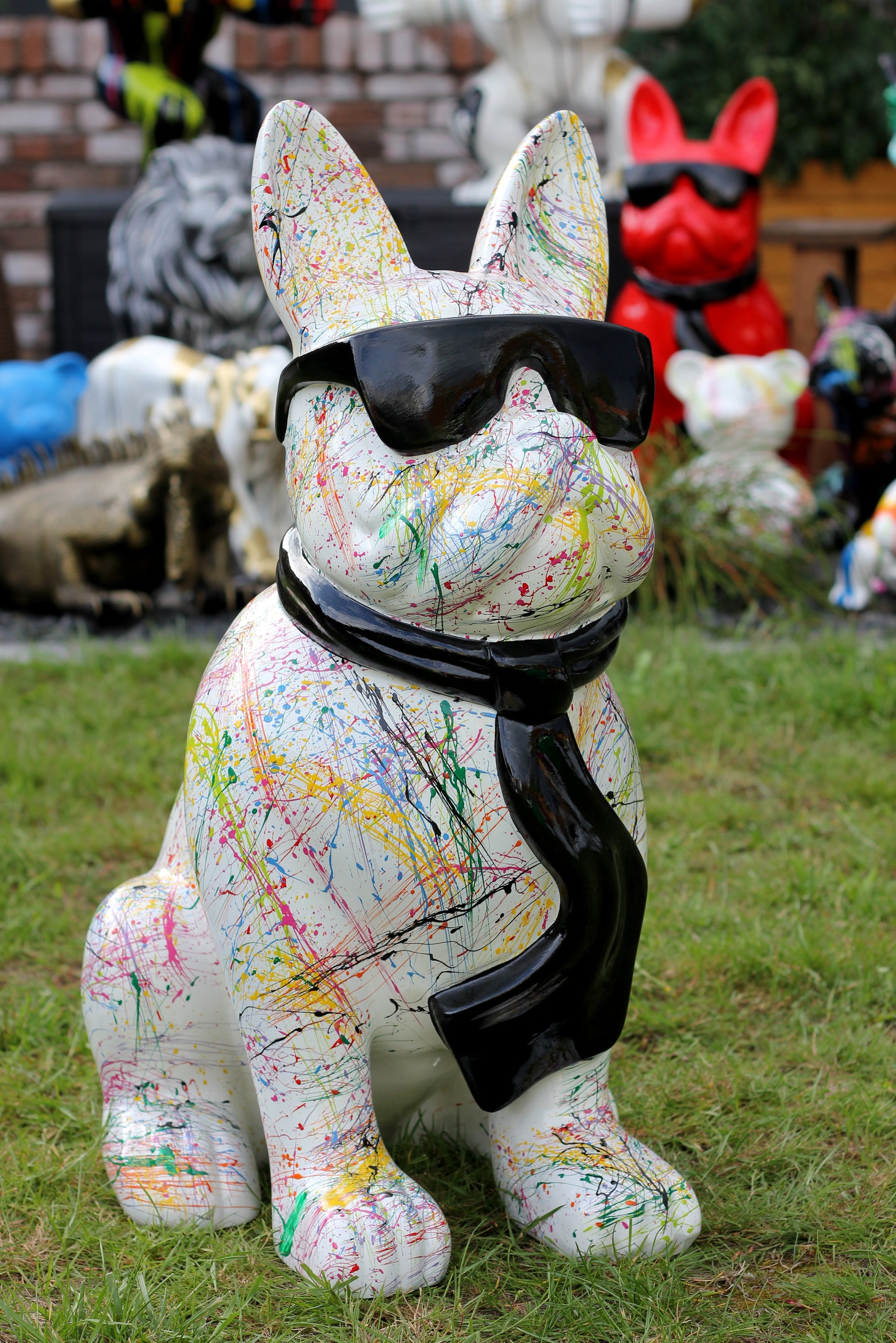 Französische Bulldogge mit Brille und Krawatte weiß-splash aus Kunstharz - 78cm